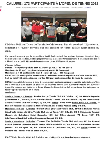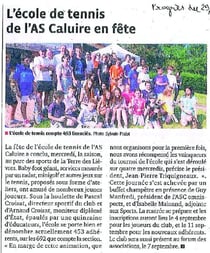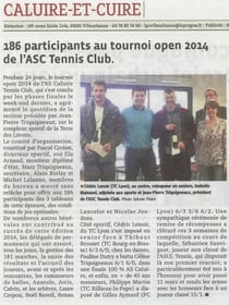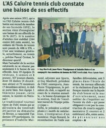 18 janvier 2014 : Jean-Pierre TRIQUIGNEAUX, président de la section tennis, dresse le bilan de la saison écoulée devant les adhérents du Tennis Club et en présence de Mme MAINAND, adjointe aux sports ainsi que M. MANFREDI, président de l'AS Caluire. Présentation du bilan financier par Yvan LARDON, trésorier du club et enfin présentation du bilan sportif par Pascal CROISAT, directeur sportif, Arnaud CROISAT, moniteur diplômé d'État et Nicolas SOLEILLAND, moniteur en contrat emploi-avenir. Article paru dans le quotidien "Le Progrès".